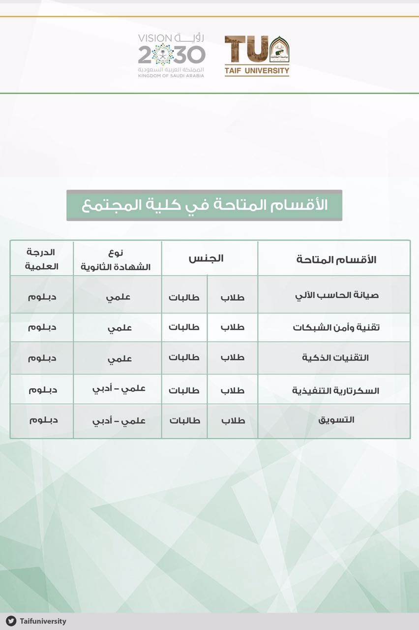 بوابة تخصصات البكالوريوس بوابة تخصصات الدبلوم بوابة طلبات التحاق ابناء العاملين في الجامعة دليل استرشادي يوضح اجراءات القبول التنسييق الموحد دليل. تمنح الكلية خريجيها درجتي البكالوريوس والدبلوم المتوسط في أربعةٍ وعشرينَ تخصصاً علمياً تقنياً ضمن برنامج دراسي متميز، وفق نظام الساعات المعتمدة، حيث يدرس الطالب 66. رئيس جامعة الطائف يكرم ثلاث كليات بالإضافة الى مركز اللغة الإنجليزية. جامعة الطائف هي من الجامعات الكبرى العريقة على مستوى المملكة, حيث يتم استخدام أحدث التكنولوجيا في الوسائل التعليمية, مع وجود. كلية العلوم التربوية وإعداد المعلمين.